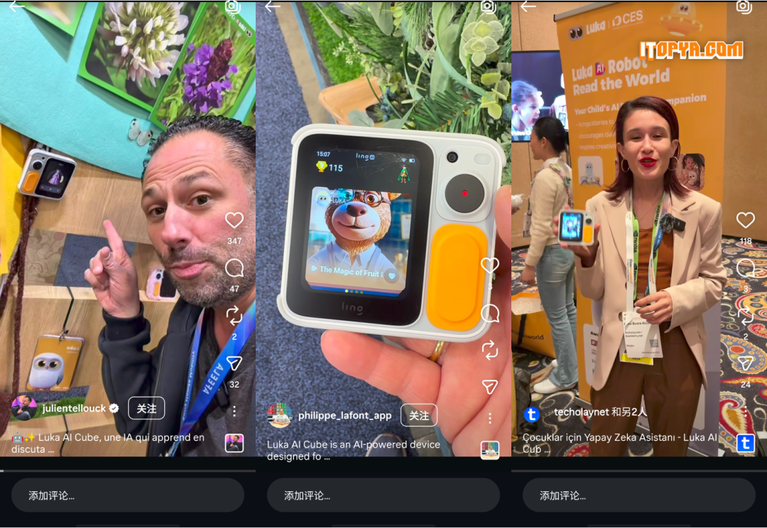 灵宇宙展台的强互动性吸引了大量全球科技博主打卡。拥有107万粉丝的YouTube博主Khan Flicks在《My Top Tech / Robot List at CES 2026!》中重点推荐了Luka Cube;土耳其头部博主Technopat(86.5万粉丝)发布的Shorts视频《AI Toys for Kids! Luka Cube》直观展示了AI玩具的魅力;拥有81.2万粉丝的Instagram博主Isabella Kubera发布了现场采访视频。