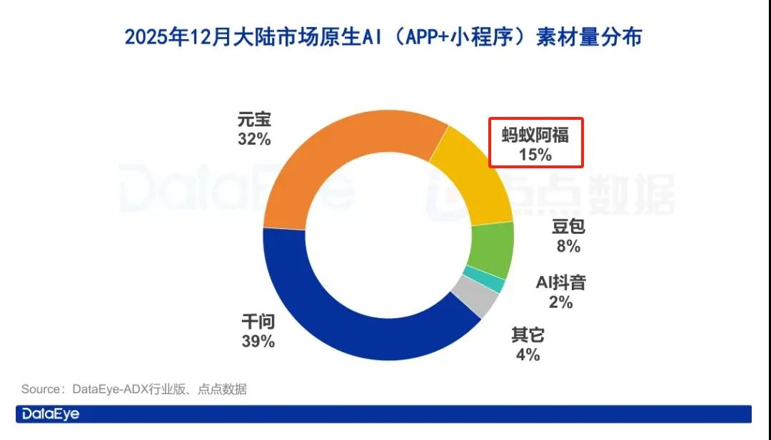 蚂蚁:后程发力,蚂蚁阿福12月投放量空降月度买量榜前三、一举反超豆包,单月共投放了超17万组素材,占该月AI应用素材投放量的15%。(数据来源:DataEye)