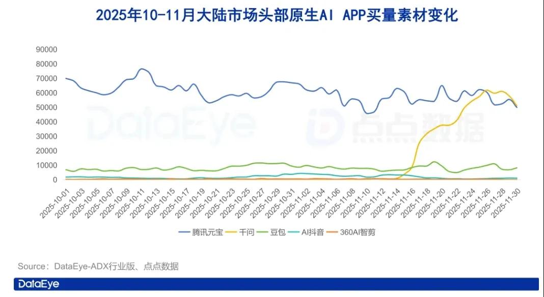 据《财经》报道,直至2025年10月,阿里的通义App(千问App前身)一度月活跃用户仅有300万,在大厂中几乎垫底。但2025年11月之后,千问App迭代明显加速,C端月活跃用户超过1亿。DataEye数据显示,千问11月投放量暴涨13726.1%,一度反超元宝。