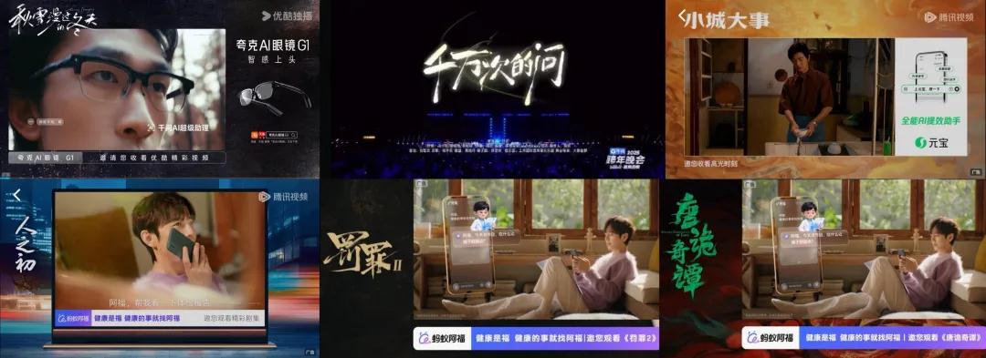 岁末年初,阿里的千问在“最美的夜”请B站用户用AI为新年干杯,刘欢压轴唱响“千万次的问”;腾讯的元宝成了腾讯视频星光大赏的直播主持人,广告也出现在了赵丽颖新剧《小城大事》片头;蚂蚁的阿福更为激进,《骄阳似我》《长安二十四计》《唐诡奇谭》《人之初》《罚罪2》等多部剧集片头均有其身影;夸克也在优酷《秋雪漫过的冬天》的片头做起了AI眼镜的推广。