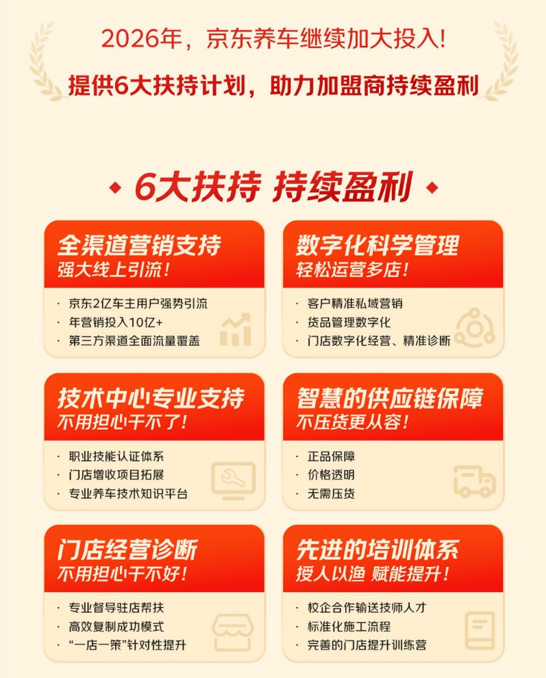 2026年,京东养车宣布将继续加大投入,推出“全渠道营销支持、数字化管理、技术中心专业支持、智慧供应链保障、门店经营诊断、先进的培训体系”共6大扶持举措,助力门店持续盈利。
