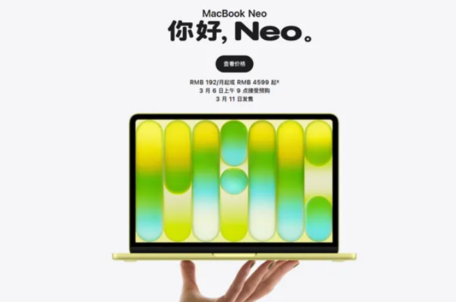 3月6日上午9点,苹果全新入门级笔记本电脑MacBook Neo正式开启预购,3月11日将全面发售。这款起售价4599元的产品刷新了苹果笔记本的价格底线,成为该公司进军低端笔记本电脑市场的最大胆尝试。