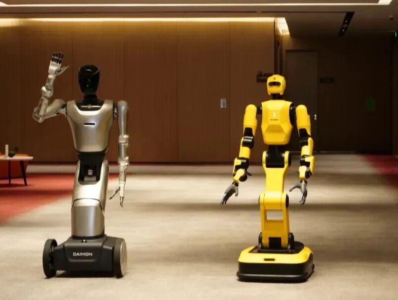 戴盟机器人(图左)是一家在具身智能领域实现核心突破的联想创投被投企业,它被视为“深圳具身智能八大金刚” 之一。图为去年10月其产品在联想集团南方智能制造基地(深圳)下线。