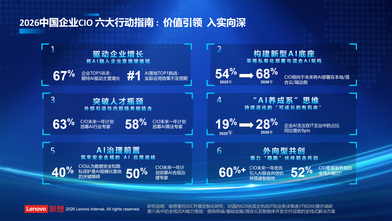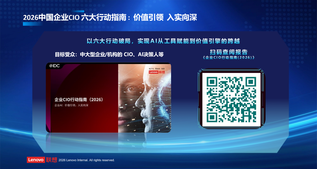 面对AI高速发展现状,全行业都在构建AI能力,使之成为企业未来创新生产力。日前,联想重磅发布《企业CIO行动指南(2026)》(以下简称《指南》),《指南》基于2026年企业AI十大趋势,聚焦当前企业AI落地痛点难题,提出六大行动指南,为企业AI规模化落地提供了清晰的路径指引。