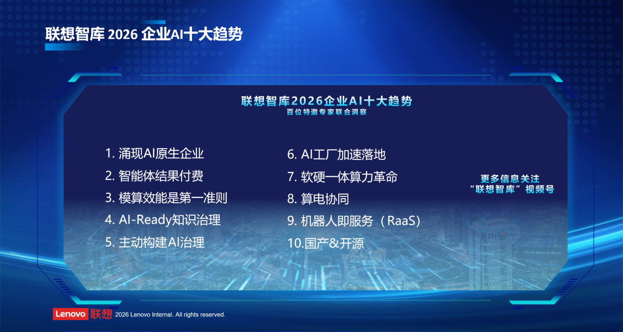 立足这一行业背景,联想智库通过对百余位联想智库专家调研,系统梳理形成2026企业AI十大趋势,覆盖了企业形态、商业模式、管理标准、行业需求等核心维度。