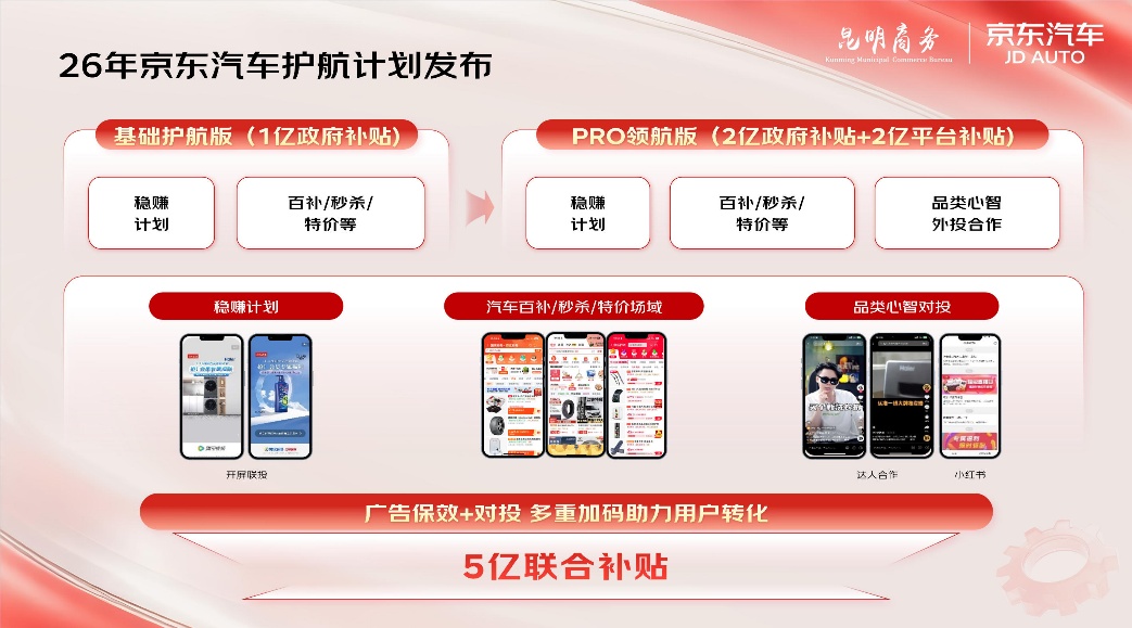 除了惠及消费者,京东汽车在大会上还重点推出了面向品牌商家的“护航计划”。该计划旨在为合作伙伴提供全链路的增长保障,通过“基础护航版”与“PRO领航版”两种模式,为核心商家提供确定性的广告流量与核心营销场域资源支持。基础版将深度绑定“稳赚计划”与“百亿补贴、秒杀”等核心促销频道,保障商品价格竞争力与转化效率;PRO版更将联合小红书等外部平台进行品类心智共建,实现全域营销赋能。该计划还将通过“政府补贴+平台补贴”双重兜底,助力商家在2026年复杂市场环境中实现稳健经营与增长突破。