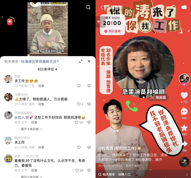 早在今年2月,杜海涛便在其快手账号发布视频,帮助网友实现心愿,评论区中“帮忙找份工作”的呼声最高。3月19日,《你的涛来了-帮你找工作》节目正式官宣后,杜海涛收到大量粉丝私信——有陪老伴赴京看病、希望找份家政工作的50岁阿姨;有面临再就业的十年工厂工人;还有渴望在一线城市立足的985名校硕士……网友纷纷留言:“还愁工作不好找吗?那就找涛哥!”“太棒了,帮助普通人!”“好有意义的节目,期待!”