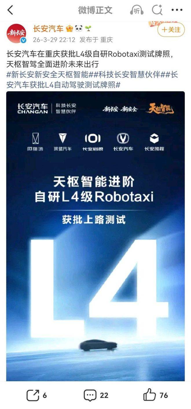 长安汽车获L4级Robotaxi测试牌照 重庆“智车之都”建设驶入快车道