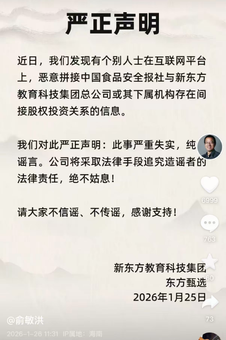 声明称,近日,我们发现有个别人士在互联网平台上,恶意拼接中国食品安全报社与新东方教育科技集团总公司或其下属机构存在间接股权投资关系的信息。此事严重失实,纯属谣言。公司将采取法律手段追究造谣者的法律责任。
