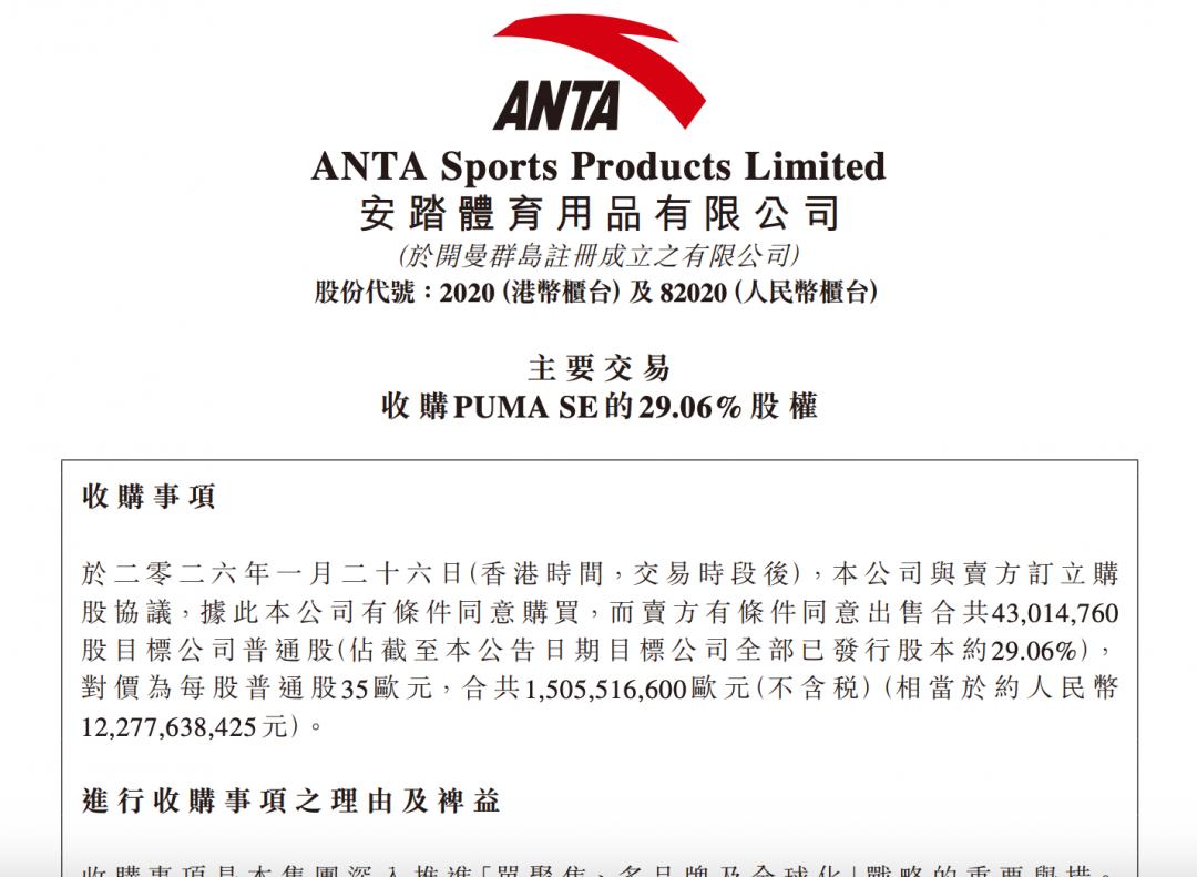1月27日消息,今日早间,安踏体育在港交所公告称,拟以15亿欧元收购彪马公司29.06%的股份。