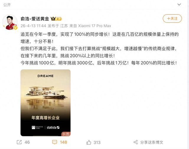 2026年4月13日,俞浩带着追觅一季度100%的增长数据回归微博,喊出今年挑战1000亿的目标,这不是狂妄,是一个中国创业者,对自己、对时代、对中国科技力量的笃定。
