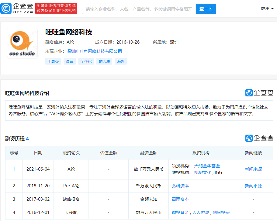 深圳哇哇鱼网络科技有限公司(以下简称:哇哇鱼)成立于 2016 年底,公司初期推出的 iMoreKeyboard,是拥有多语言数据模型和社交功能的手机翻译输入法,可实现全球 144 个国家文字的任意翻译转换。凭借工具研发团队基因及多年出海经验积累,哇哇鱼围绕智能手机应用场景,陆续延申出包括休闲游戏、社交工具在内的多元化产品矩阵,同时也成长为一家全球化游戏应用研发发行服务商。