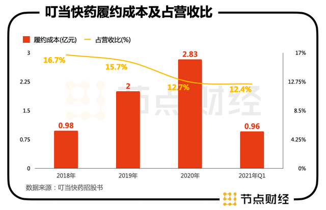 招股书显示,2018-2021年Q1,叮当快药在履约上付出的成本分别是9750万元、2亿、2.83亿、9600万,占营收比重分别为16.7%、15.7%、12.7%和12.4%,同期,叮当快药在销售及市场推广层面的投入分别为1.4亿、2.8亿、4.41亿、1.75亿,占营收比重分别为24.1%、21.8%、19.8%和22.5%。