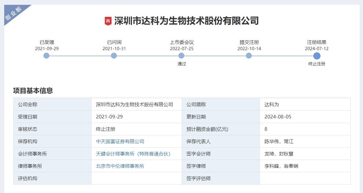 8月5日,深交所官网显示,因深圳市达科为生物技术股份有限公司(下称“达科为”)及其保荐人中天国富证券主动撤回注册申请文件,根据有关规定,深交所决定终止其创业板IPO审核。