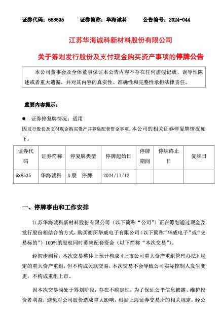 据华海诚科公告,本次交易预计构成重大资产重组,但不构成关联交易,也不会导致公司实际控制人发生变更。由于交易尚处于筹划阶段,存在不确定性,华海诚科股票自11月12日起开始停牌,预计停牌时间不超过5个交易日。