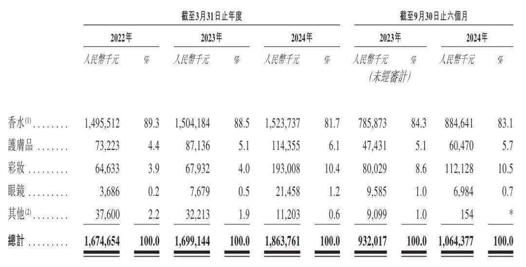 截至2024年9月30日的半年,颖通控股来自香水的收入为8.85亿元,占收入比例为83.1%;来自彩妆收入为1.12亿元,占比为10.5%。