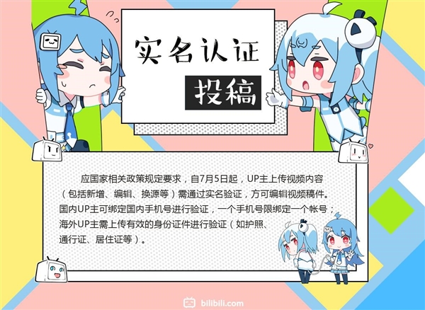 应国家相关政策要求,自7月5日起,UP主上传视频内容(包括新增,编辑,换源等)需通过实名认证。国内UP主可绑定国内手机号验证,国外需要上传有效身份证件(如护照、通行证、居住证等)。