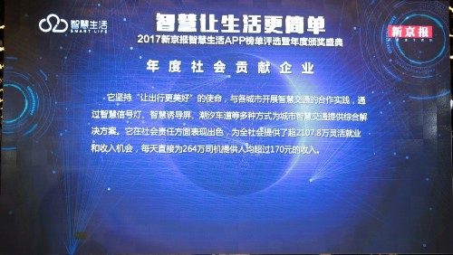 原标题:滴滴荣获2017“年度社会贡献企业”大奖