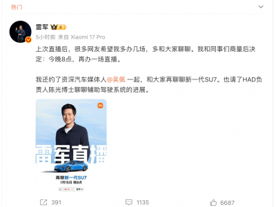 雷军今晚8点再开直播 携陈光博士详解SU7及辅助驾驶新进展