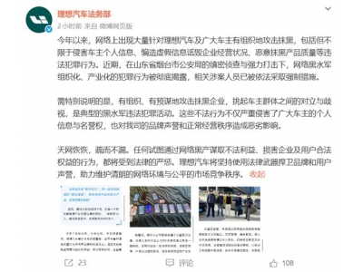 理想汽车法务部今日转发烟台公安通报,称今年以来网络上出现大量针对理想汽车及车主的有组织攻击抹黑行为,包括侵害车主个人信息、编造虚假信息诋毁企业经营状况、恶意抹黑产