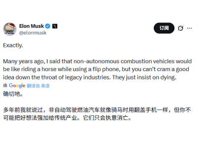 特斯拉CEO埃隆•马斯克昨日在X平台上发文,对传统汽车行业发出强烈警告:"非自动驾驶燃油车就像骑马时用翻盖手机一样,但你不可能把好的想法强加给传统产业,它们只会执意消亡