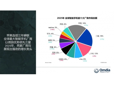 全球权威显示与智能设备研究机构Omdia发布《2025年全球智能手机市场报告》,数据显示,2025年全球智能手机出货量达12.5亿部,同比增长2%,创下自2021年以来的最高水平。尽管全球经济