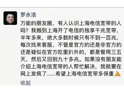 日前,知名博主罗永浩在朋友圈公开吐槽,称其自半年多前在上海开通电信独享千兆宽带后,网速在绝大多数时候均不到一百兆。他表示,尽管多次联系官方及非官方客服,问题虽能短