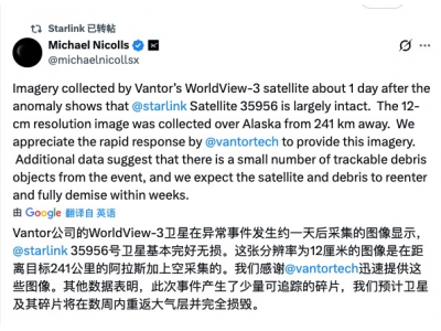 美国“星链”一颗卫星或发生爆炸失联 数十块碎片可能对其他在轨卫星构成威