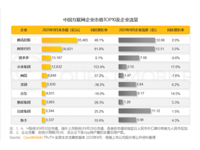 驱动中国2025年11月5日消息 近日,QuestMobile发布2025年9月中国互联网企业市值TOP及企业流量排名,腾讯稳居榜首,阿里、拼多多紧随其后。 数据显示,腾讯控股以5.55万亿元的市值稳居第