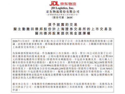 1月14日消息,京东物流股份有限公司(股份代号:2618)昨日晚间发布公告宣布,其全资子公司宿迁京东卓风已提出,并经德邦物流股份有限公司董事会批准,计划通过股东大会决议方式