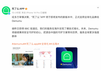 1月14日消息,昨日晚间,据“死了么APP”官博消息,经多方审慎决策,“死了么”APP将于即将发布的新版本中,正式启用全球化品牌名Demumu。 继昨日获得外媒报道后,我们的服务在海外