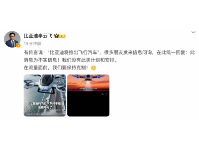 比亚迪辟谣将推出飞行汽车 没有此类计划和安排