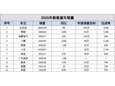 元旦假期,各大新能源车企相继交出了2025全年销量的成绩单。 从销量达成率来看,虽然多数品牌在2025年销量均创新高,但仅有4个品牌完成年度销量目标。 零跑汽车以119.31%的达成率位