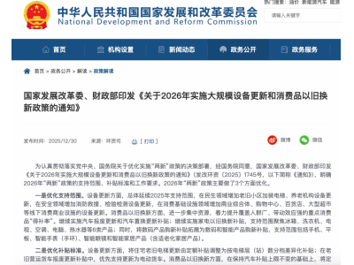 12月31日消息,12月30日,国家发展改革委、财政部印发《关于2026年实施大规模设备更新和消费品以旧换新政策的通知》(以下简称《通知》)。 2026年“两新”政策主要做了3个方面优化