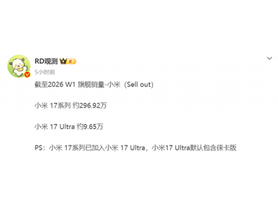 博主"RD观测"近日发布了2026年第一周的小米旗舰机型销量数据,显示小米17系列在元旦期间表现强劲,总销量约达296.92万,其中小米17 Ultra(默认包含徕卡版)单款销量约9.65万。这一成绩延
