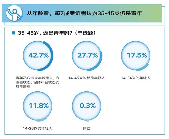 调研结果显示,超过七成的受访者认为35至45岁仍属于青年范畴。其中,42.7%的受访者强调,青年不应被年龄所定义,而应看重心态,保持年轻态的人即是青年。另有27.7%的受访者则直接指出,青年的年龄段应涵盖14至45岁,因此35至45岁无疑属于青年。活跃的思维、对新事物的敏感、快速思考和反应的能力,以及保持好奇心和热情的态度,成为描述这一群体特征的主要关键词。