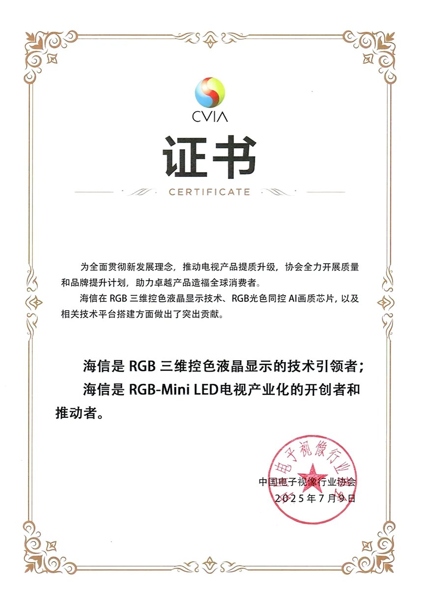 此次技术认证的获得,不仅彰显了海信在RGB-Mini LED领域的技术实力与创新能力,也为中国显示产业的高质量发展树立了标杆。随着海信不断突破技术瓶颈、完善产业链布局,必将持续推动全球显示技术的升级与变革,为行业和消费者创造更大价值。