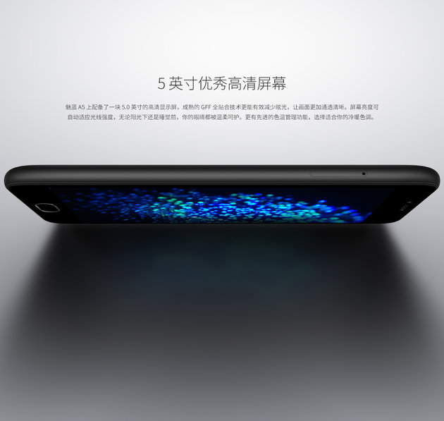 而在配置方面,魅蓝A5采用5英寸720p屏幕,搭载1.3GHz四核处理器(联发科MT6737),提供2GB+16GB存储组合,前置500万像素+后置800万像素主摄像头,附带美颜功能和双色温灯,内置3000mAh容量电池。